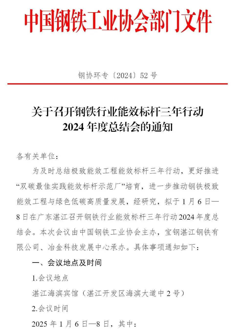關(guān)于召開鋼鐵行業(yè)能效標(biāo)桿三年行動(dòng)2024年度總結(jié)會(huì)的通知?