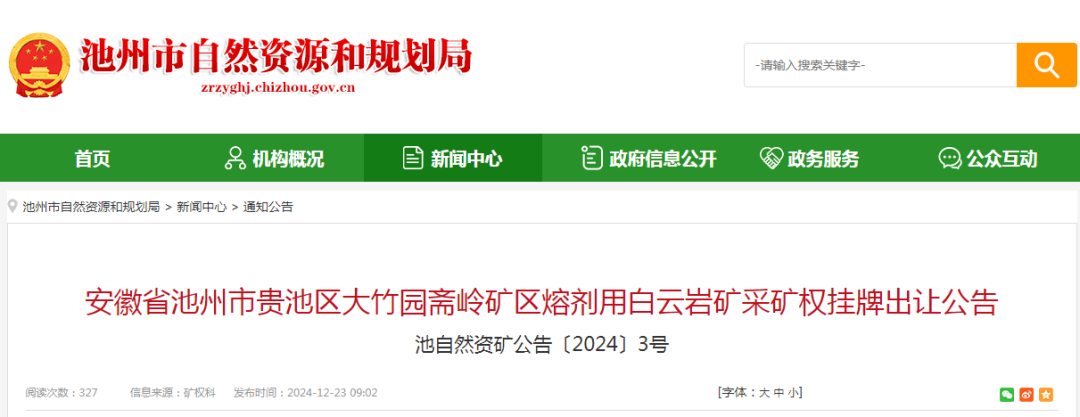 近日,池州市自然資源規(guī)劃局發(fā)布安徽省池州市貴池區(qū)大竹園齋嶺礦區(qū)熔劑用白云巖礦采礦權掛牌出讓公告。