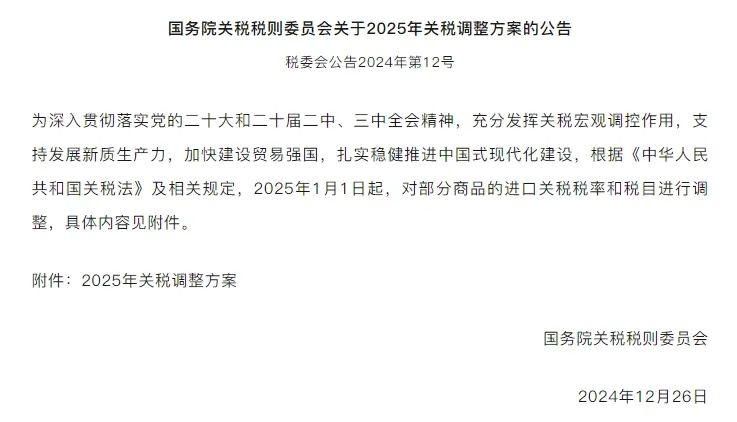 經(jīng)國(guó)務(wù)院批準(zhǔn),國(guó)務(wù)院關(guān)稅稅則委員會(huì)2024年12月28日對(duì)外發(fā)布公告,2025年將調(diào)整部分商品的進(jìn)口關(guān)稅稅率和稅目,自今天起正式實(shí)施。