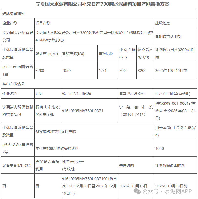 置換方案顯示,寧夏國(guó)大水泥有限公司日產(chǎn)3200噸熟料新型干法水泥生產(chǎn)線建設(shè)項(xiàng)目(帶4.5MW余熱發(fā)電)補(bǔ)充7000/t產(chǎn)能,1050t/d出讓產(chǎn)能來(lái)自寧夏諾力環(huán)保新材料有限公司,置換比例1.5:1。