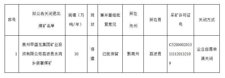 根據(jù)《國(guó)務(wù)院關(guān)于煤炭行業(yè)化解過剩產(chǎn)能實(shí)現(xiàn)脫困發(fā)展的意見》(國(guó)發(fā)〔2016〕7號(hào))、《關(guān)于加快推進(jìn)兼并重組煤礦分類處置促進(jìn)煤炭產(chǎn)業(yè)轉(zhuǎn)型升級(jí)發(fā)展的通知》(黔能源煤炭〔2020〕100號(hào))、《省能源局關(guān)于進(jìn)一步做好煤炭產(chǎn)能置換工作的通知》(黔能源發(fā)〔2022〕14號(hào))等文件精神,依企業(yè)申請(qǐng),經(jīng)屬地政府同意,現(xiàn)按程序?qū)?025年第一批自愿申請(qǐng)關(guān)閉煤礦名單進(jìn)行公示(見下表),公示時(shí)間:2025年1月8日至2025年1月14日,若發(fā)現(xiàn)公示信息有誤,請(qǐng)致電更正,聯(lián)系電話:0851—86891303。