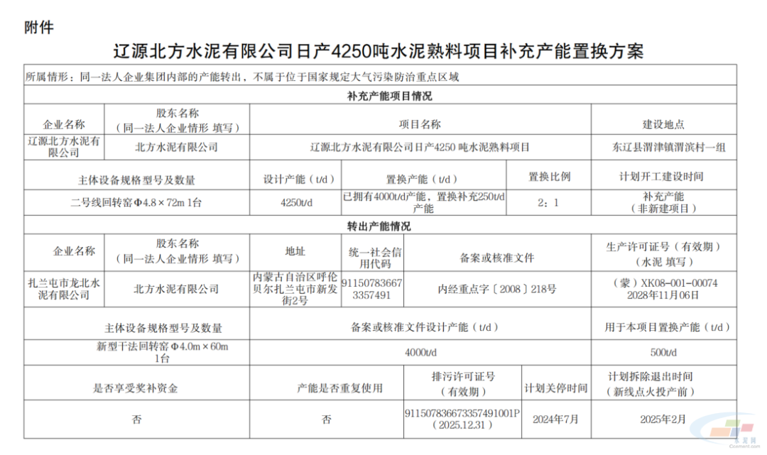 方案顯示,遼源北方水泥有限公司日產(chǎn)4250噸水泥熟料項(xiàng)目設(shè)計(jì)產(chǎn)能4250t/d,已擁有4000t/d產(chǎn)能,置換補(bǔ)充250t/d產(chǎn)能。扎蘭屯市龍北水泥有限公司出讓500t/d至遼源北方水泥,置換比例2∶1。該置換項(xiàng)目屬于同一法人企業(yè)集團(tuán)內(nèi)部的產(chǎn)能轉(zhuǎn)出。
