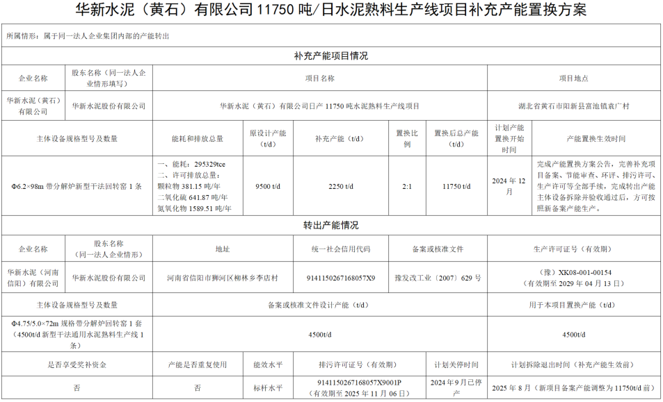 安徽荻港海螺水泥股份有限公司現(xiàn)有1條2000t/d水泥熟料生產(chǎn)線,由于其規(guī)模小、能耗高,擬將該產(chǎn)能置換到同一廠區(qū)內(nèi)2條4500t/d水泥熟料生產(chǎn)線。方案顯示,荻港海螺水泥兩條4500t/d水泥熟料線產(chǎn)能調(diào)整為5500t/d,置換產(chǎn)能1000t/d,置換比例1∶1。退出一條2000t/d熟料線,公告之日起關停,履行國有資產(chǎn)處置程序后拆除。