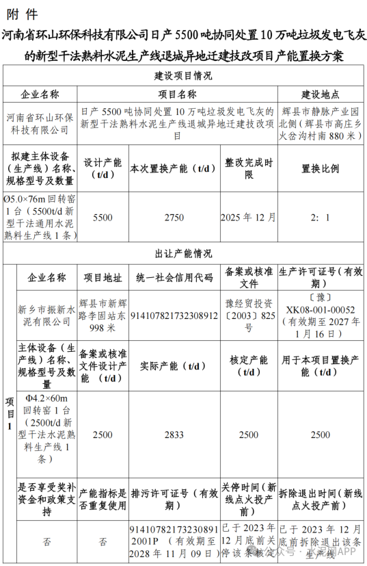 1月7日,河南省輝縣市工信局發(fā)布“關(guān)于河南省環(huán)山環(huán)??萍加邢薰救债a(chǎn)5500噸協(xié)同處置10萬噸垃圾發(fā)電飛灰的新型干法熟料水泥生產(chǎn)線退城異地遷建技改項目產(chǎn)能置換方案的公示”。