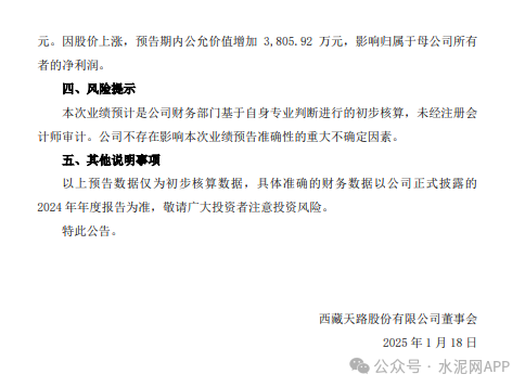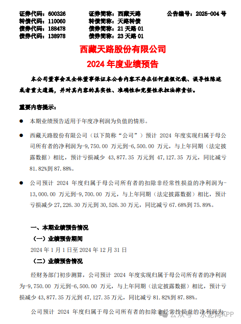 西藏天路1月17日晚間披露2024年度業(yè)績預告,預計2024年度實現(xiàn)歸屬于母公司所有者的凈利潤為-9,750.00萬元到-6,500.00萬元,與上年同期(法定披露數(shù)據(jù))相比,預計虧損減少43,877.35萬元到47,127.35萬元,同比減虧81.82%到87.88%。