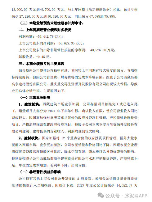 預告期內公司整體經(jīng)營穩(wěn)中有進,利潤較上年同期有較大幅度的減虧,各項指標持續(xù)好轉。但因公司管理費、財務費等固定成本降幅有限,控股子公司西藏昌都高爭建材股份有限公司、重慶重交再生資源開發(fā)股份有限公司出現(xiàn)較大虧損,導致公司總體業(yè)績虧損。