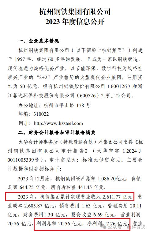 2024年6月24日,杭鋼集團(tuán)發(fā)布2023年度信息公開(kāi)!2023年,杭鋼集團(tuán)累計(jì)實(shí)現(xiàn)營(yíng)業(yè)收入2,611.77億元,營(yíng) 業(yè)成本2,605.87億元,銷售費(fèi)用 1.63億元,管理費(fèi)用20.11億元,財(cái)務(wù)費(fèi)用1.30億元,投資收益6.69億元,營(yíng)業(yè)利潤(rùn)20.76億元,利潤(rùn)總額20.56億元,凈利潤(rùn)17.76億元。營(yíng)業(yè)利潤(rùn)率0.79%,凈資產(chǎn)收益率4.08%。