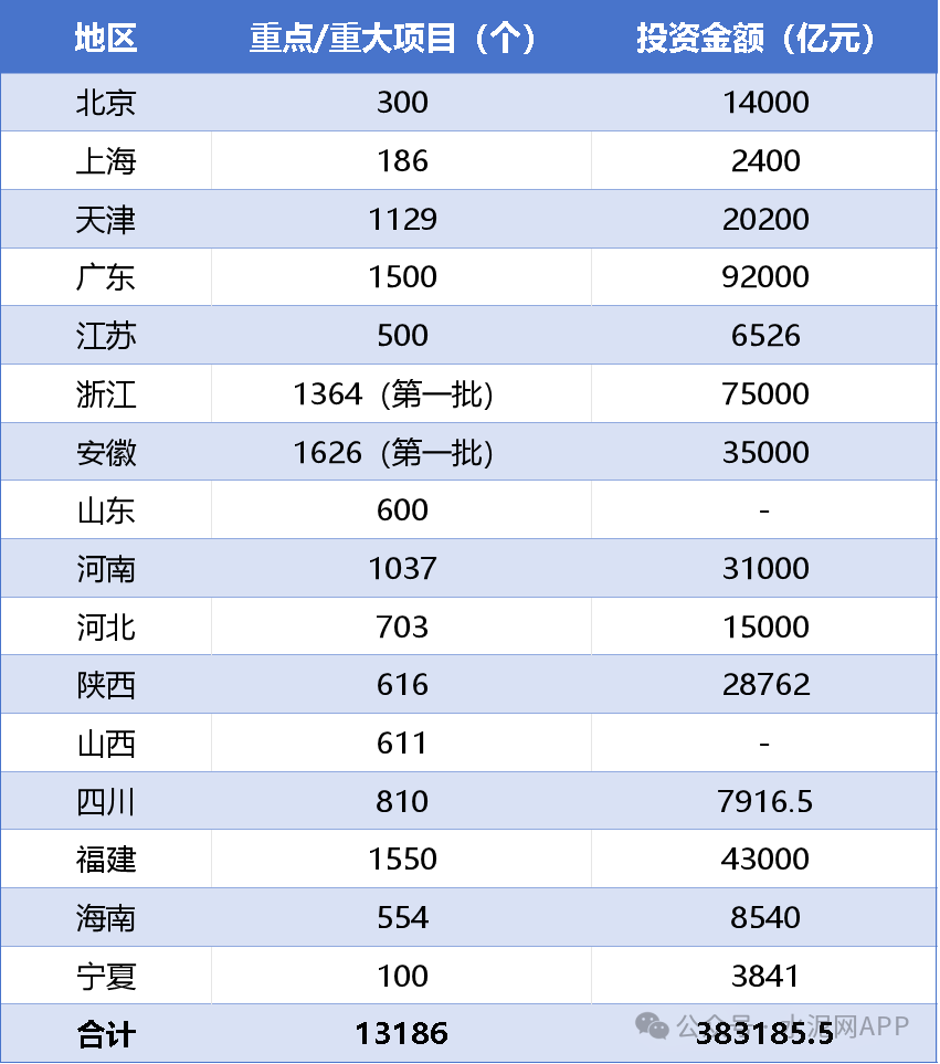 據(jù)不完全統(tǒng)計(jì),截至目前,全國已有16個(gè)省市自治區(qū)發(fā)布2025年重點(diǎn)工程項(xiàng)目相關(guān)投資計(jì)劃,總項(xiàng)目數(shù)超1.3萬個(gè),總投資額合計(jì)超38萬億元。