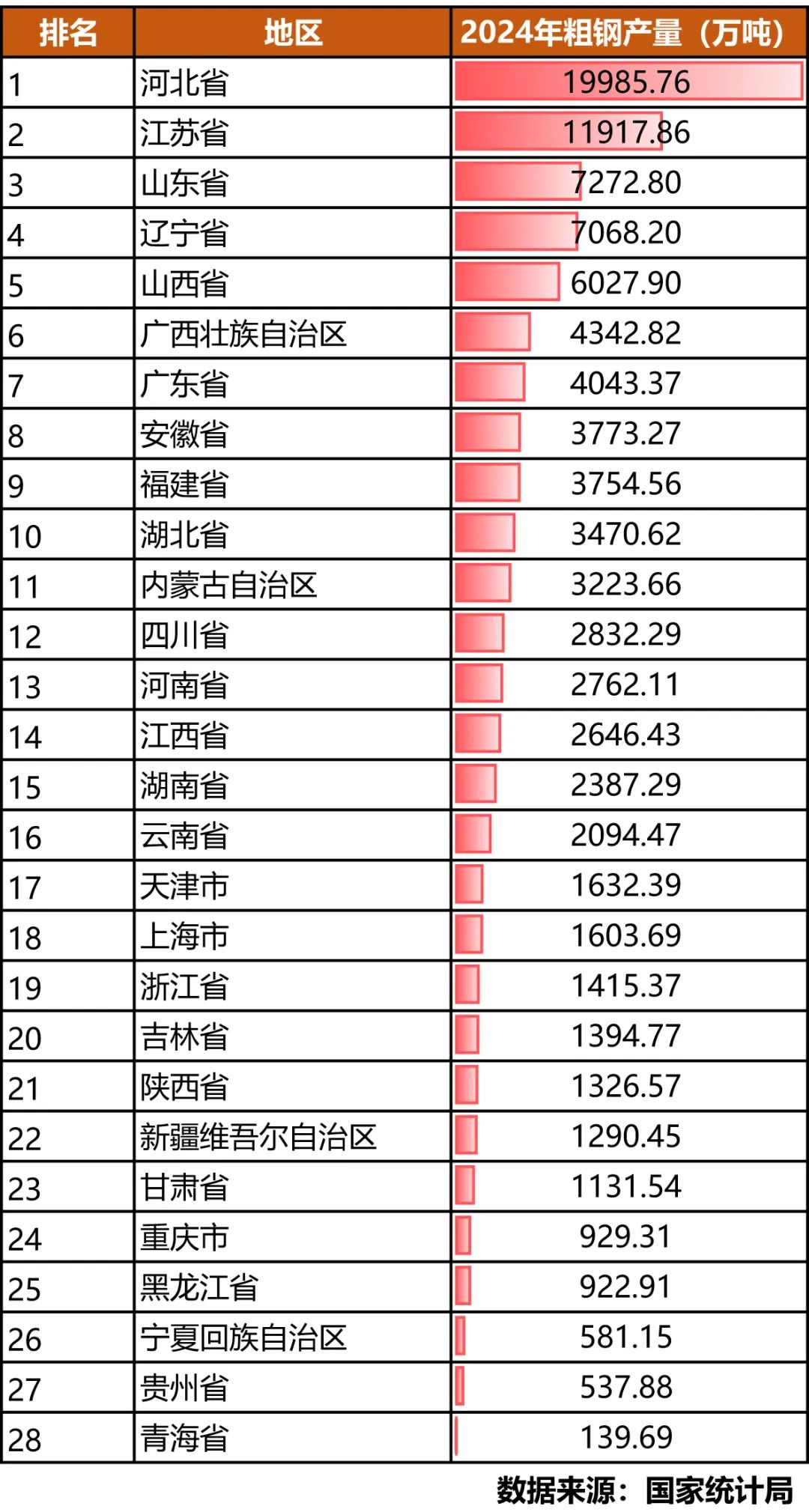 據(jù)國家統(tǒng)計局數(shù)據(jù),2024年粗鋼產(chǎn)量前10省份依次為河北、江蘇、山東、遼寧、山西、廣西、廣東、安徽、福建、湖北。