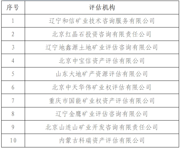 按照《遼寧省自然資源廳關(guān)于公開(kāi)遴選礦業(yè)權(quán)出讓收益評(píng)估機(jī)構(gòu)的公告》要求,經(jīng)綜合評(píng)定,確定入圍機(jī)構(gòu)名單如下,特此公告。