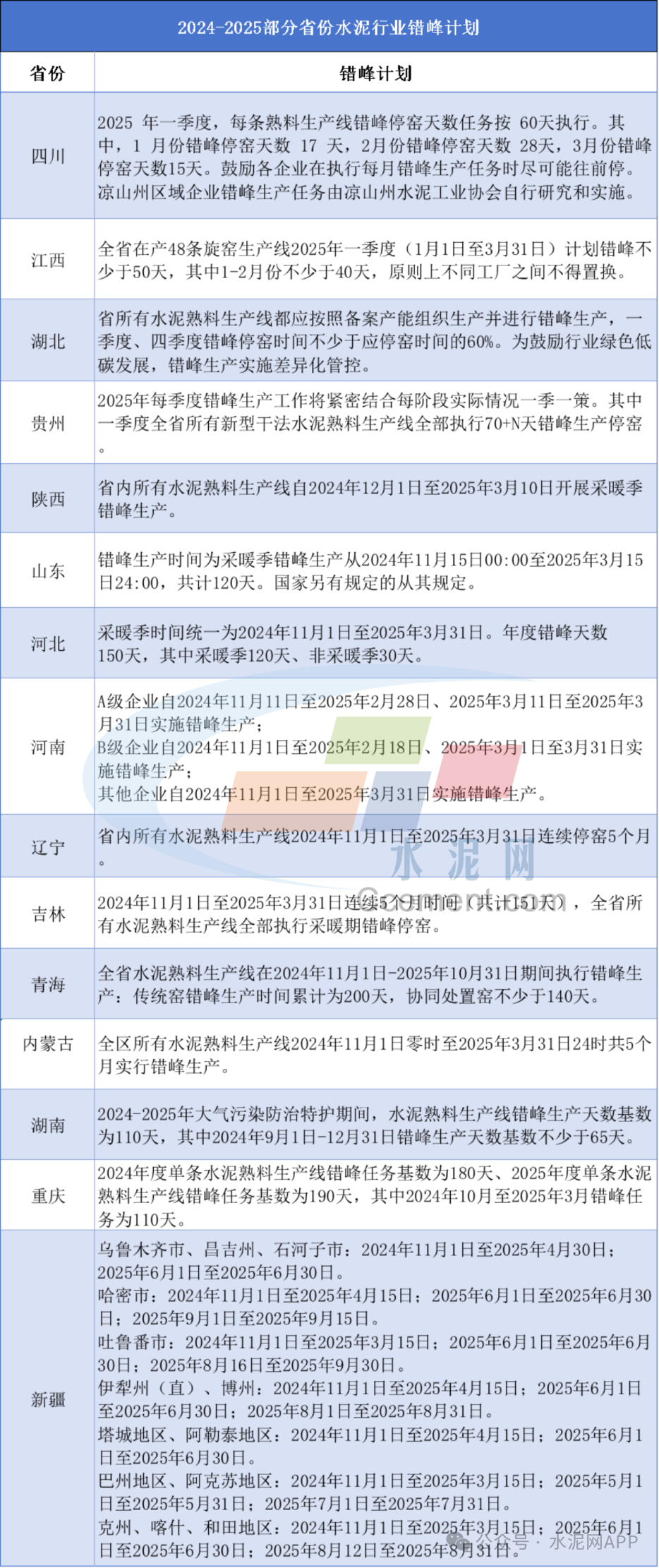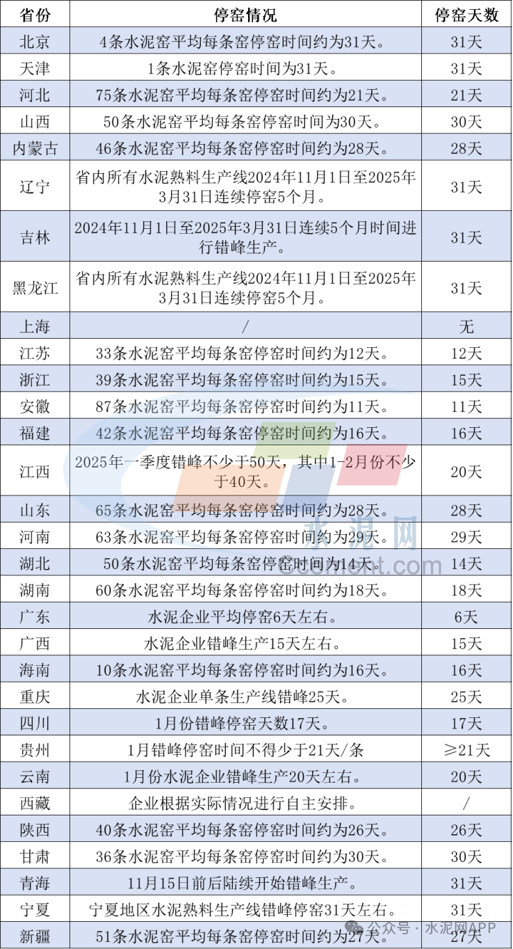 2025年部分省份水泥企業(yè)錯(cuò)峰計(jì)劃匯總見下表: