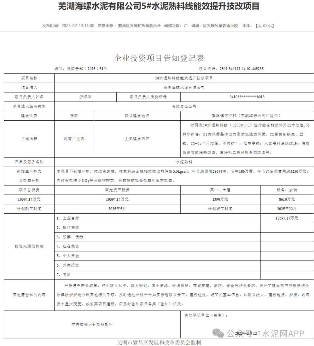 2月13日,安徽省蕪湖市繁昌區(qū)發(fā)展和改革委員會發(fā)布《蕪湖海螺水泥有限公司5#水泥熟料線能效提升技改項目》情況顯示,蕪湖海螺水泥有限公司對現(xiàn)有5#水泥熟料線(12000t/d)進(jìn)行綜合能效體升技術(shù)改造。
