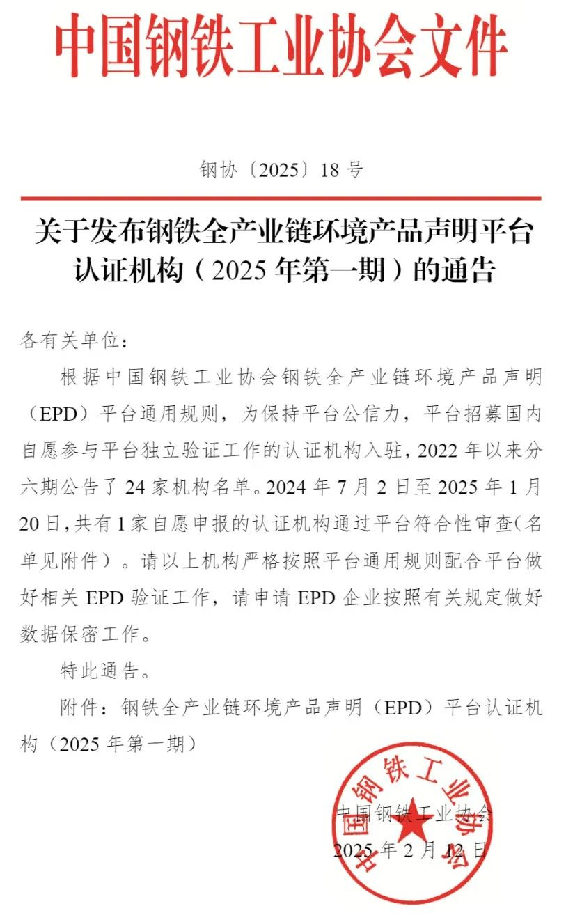 關(guān)于發(fā)布鋼鐵全產(chǎn)業(yè)鏈環(huán)境產(chǎn)品聲明平臺(tái)認(rèn)證機(jī)構(gòu)(2025年第一期)的通告