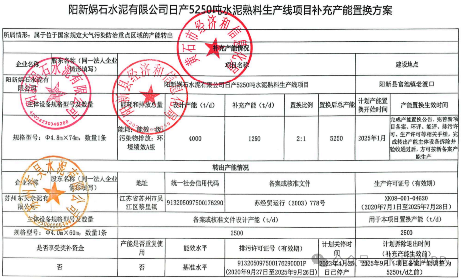 置換方案顯示,陽新媧石水泥4000t/d熟料生產(chǎn)線補充1250t/d產(chǎn)能至5250t/d,出讓產(chǎn)能來自蘇州東吳水泥2500t/d生產(chǎn)線,置換比例2:1。