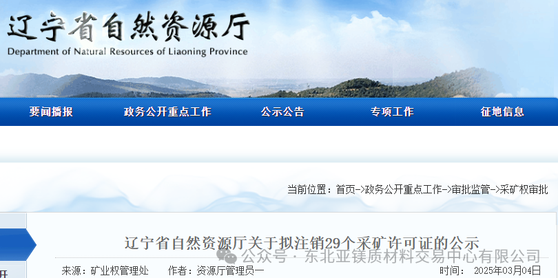 根據(jù)《礦產(chǎn)資源開(kāi)采登記管理辦法》(國(guó)務(wù)院令第241號(hào))第七條規(guī)定,采礦權(quán)人逾期不辦理延續(xù)登記手續(xù),義縣金羽螢石礦等29個(gè)采礦許可證已自行廢止。按照《自然資源部關(guān)于進(jìn)一步完善礦產(chǎn)資源勘查開(kāi)采登記管理的通知》(自然資規(guī)〔2023〕4號(hào))有關(guān)要求,我廳擬對(duì)上述采礦許可證予以公告注銷(xiāo),現(xiàn)進(jìn)行公示。