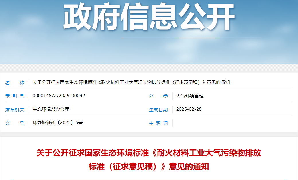 為貫徹《中華人民共和國(guó)環(huán)境保護(hù)法》和《中華人民共和國(guó)大氣污染防治法》,完善國(guó)家大氣污染物排放標(biāo)準(zhǔn)體系,促進(jìn)環(huán)境空氣質(zhì)量改善,我部組織編制了國(guó)家生態(tài)環(huán)境標(biāo)準(zhǔn)《耐火材料工業(yè)大氣污染物排放標(biāo)準(zhǔn)(征求意見(jiàn)稿)》,現(xiàn)公開(kāi)征求意見(jiàn)。征求意見(jiàn)稿和編制說(shuō)明可在我部網(wǎng)站(http://www.mee.gov.cn/)“意見(jiàn)征集”欄目檢索查閱。