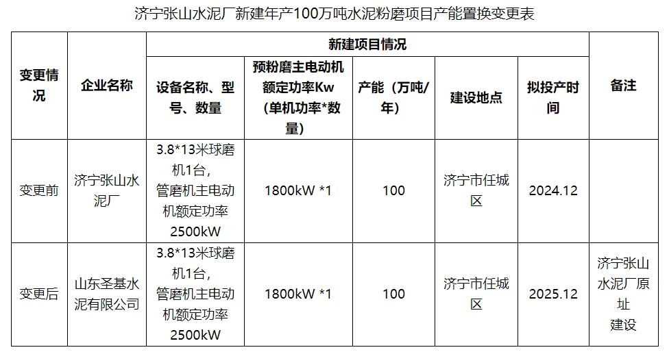 公告顯示,濟(jì)寧張山水泥廠新建年產(chǎn)100萬(wàn)噸水泥粉磨項(xiàng)目擬變更產(chǎn)能置換實(shí)施主體為山東圣基水泥有限公司。