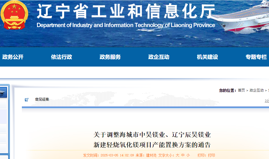 按照《遼寧省人民政府辦公廳關(guān)于推進(jìn)菱鎂行業(yè)高質(zhì)量發(fā)展的實(shí)施意見》(遼政辦發(fā)〔2023〕15號(hào))、《遼寧省菱鎂礦浮選及鎂砂行業(yè)產(chǎn)能置換辦法》(遼工信建材〔2024〕18號(hào))要求,根據(jù)企業(yè)申請、鞍山市初審和申請,因建設(shè)內(nèi)容、建設(shè)地點(diǎn)等項(xiàng)目內(nèi)容變更,對海城市中昊鎂業(yè)有限公司、遼寧辰昊鎂業(yè)有限公司新建輕燒氧化鎂項(xiàng)目產(chǎn)能置換方案進(jìn)行調(diào)整,現(xiàn)對調(diào)整后的產(chǎn)能置換方案重新予以通告。