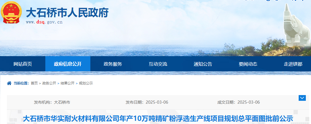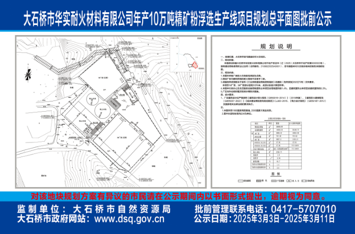 大石橋市華實(shí)耐火材料有限公司年產(chǎn)10萬噸精礦粉浮選生產(chǎn)線項(xiàng)目規(guī)劃總平面圖批前公示