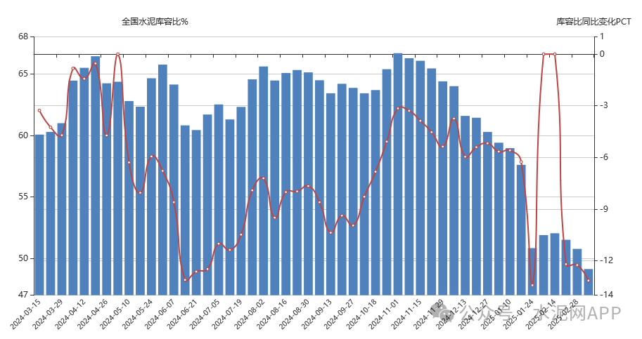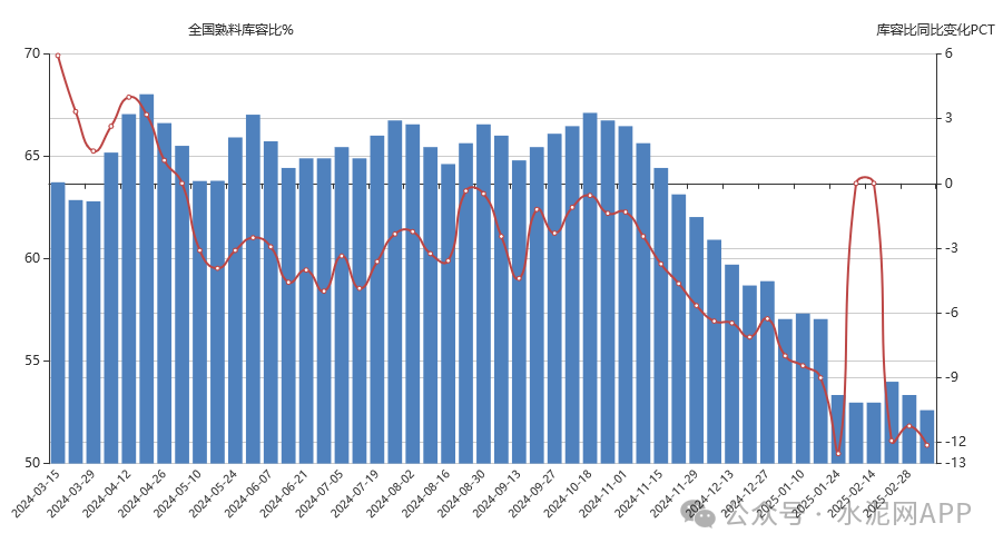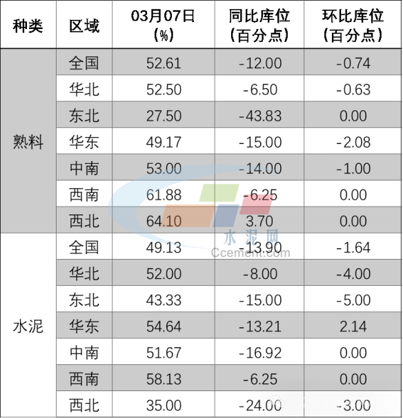 熟料方面,截至3月7日,全國(guó)熟料庫(kù)容比為52.61%,連續(xù)下降2周,較去年同期下降12%。