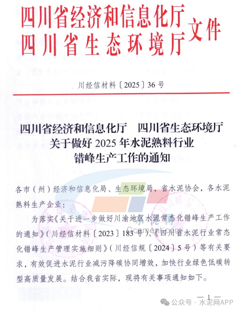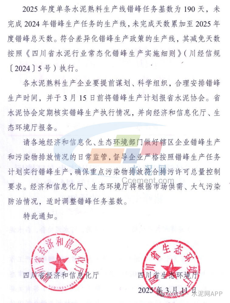 近日,四川省經(jīng)濟和信息化廳 四川省生態(tài)環(huán)境廳發(fā)布《關(guān)于做好2025年水泥熟料行業(yè)錯峰生產(chǎn)工作的通知》。