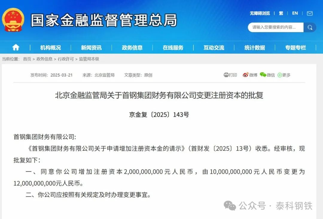 3月21日,北京金融監(jiān)管局公布相關(guān)批復(fù),同意首鋼集團(tuán)財務(wù)有限公司(簡稱“首鋼集團(tuán)財務(wù)公司”)增加注冊資本20億元(2,000,000,000元)人民幣,由100億元(10,000,000,000元)人民幣變更為120億元(12,000,000,000元)人民幣。以下是相關(guān)批復(fù)正文: