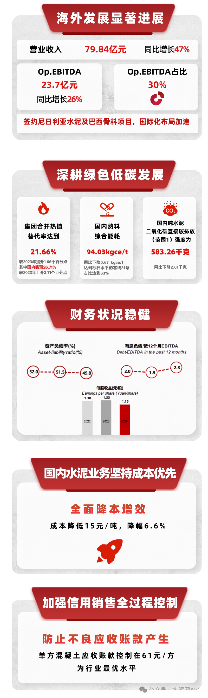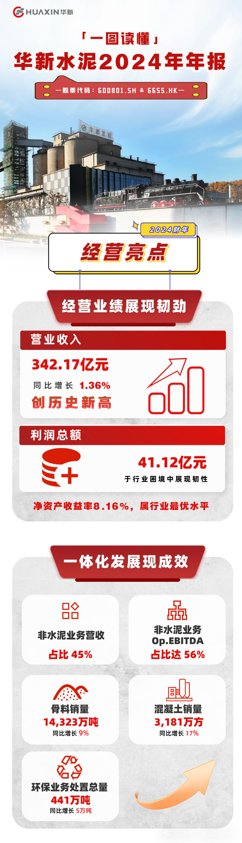 3月27日,華新水泥發(fā)布2024年年報,公司實現(xiàn)營業(yè)總收入342.17億元,同比增長1.36%,歸母凈利潤24.16億,同比下降12.52%。