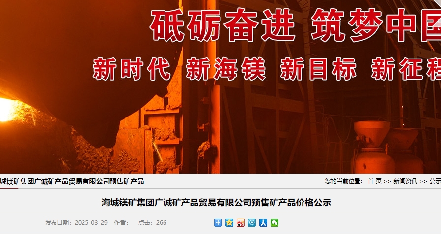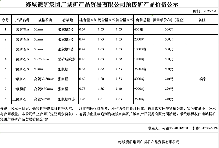 海城鎂礦集團廣誠礦產(chǎn)品貿(mào)易有限公司預售礦產(chǎn)品價格公示