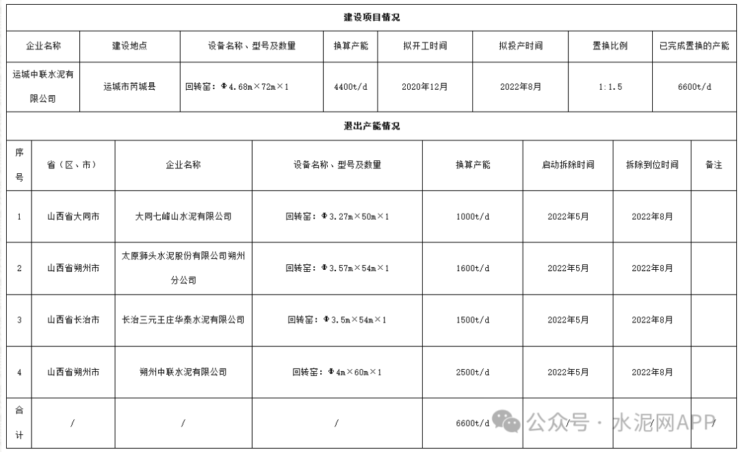 據(jù)了解,2020年9月,山西工信廳發(fā)布《運(yùn)城中聯(lián)水泥有限公司建設(shè)項(xiàng)目產(chǎn)能置換方案公告》,運(yùn)城中聯(lián)水泥擬建4400t/d水泥熟料線。置換方案如下: