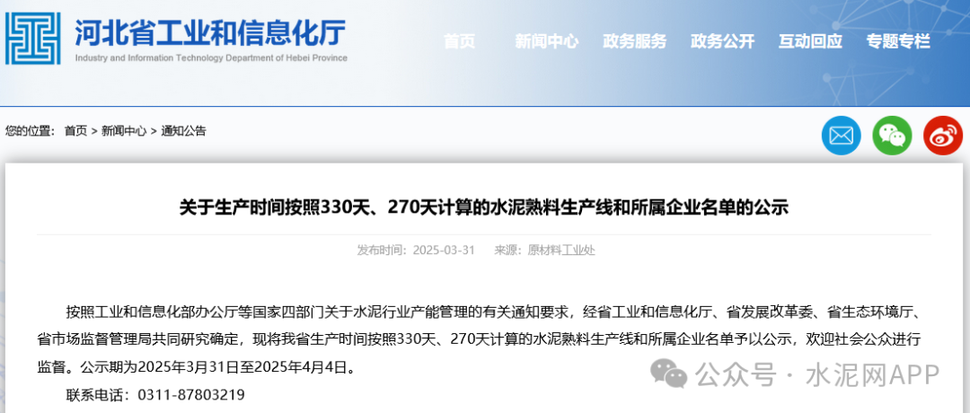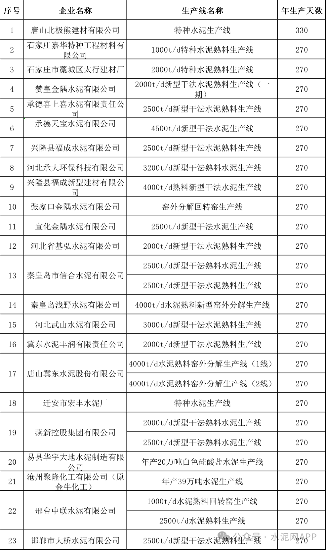 近日,河北省工信廳發(fā)布“關(guān)于生產(chǎn)時(shí)間按照330天、270天計(jì)算的水泥熟料生產(chǎn)線和所屬企業(yè)名單的公示”稱,按照工業(yè)和信息化部辦公廳等國(guó)家四部門(mén)關(guān)于水泥行業(yè)產(chǎn)能管理的有關(guān)通知要求,經(jīng)省工業(yè)和信息化廳、省發(fā)展改革委、省生態(tài)環(huán)境廳、省市場(chǎng)監(jiān)督管理局共同研究確定,現(xiàn)將河北省生產(chǎn)時(shí)間按照330天、270天計(jì)算的水泥熟料生產(chǎn)線和所屬企業(yè)名單予以公示。內(nèi)容顯示,1家水泥企業(yè)生產(chǎn)時(shí)間按照330天計(jì)算,22家企業(yè)按照270天計(jì)算。(據(jù)了解,按照最新版水泥行業(yè)產(chǎn)能置換實(shí)施辦法,水泥年產(chǎn)能天數(shù)按照300天計(jì)算。)