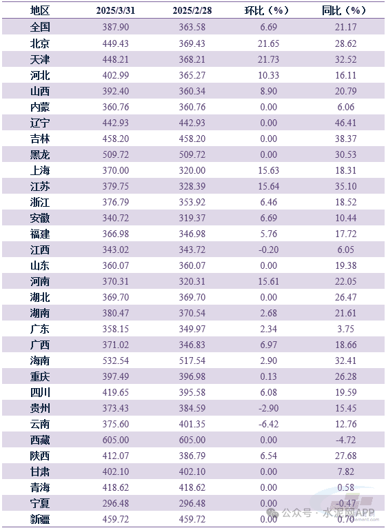2025年3月末,全國P.O42.5散裝水泥均價為387.9元/噸,環(huán)比上漲6.69%,同比上漲21.17%。3月價格環(huán)比上漲的?。ㄊ校┯?7個,11個?。ㄊ校┏制剑?個?。ㄊ校﹥r格出現(xiàn)下跌。其中京津地區(qū)漲幅較大,幅度均超20%。