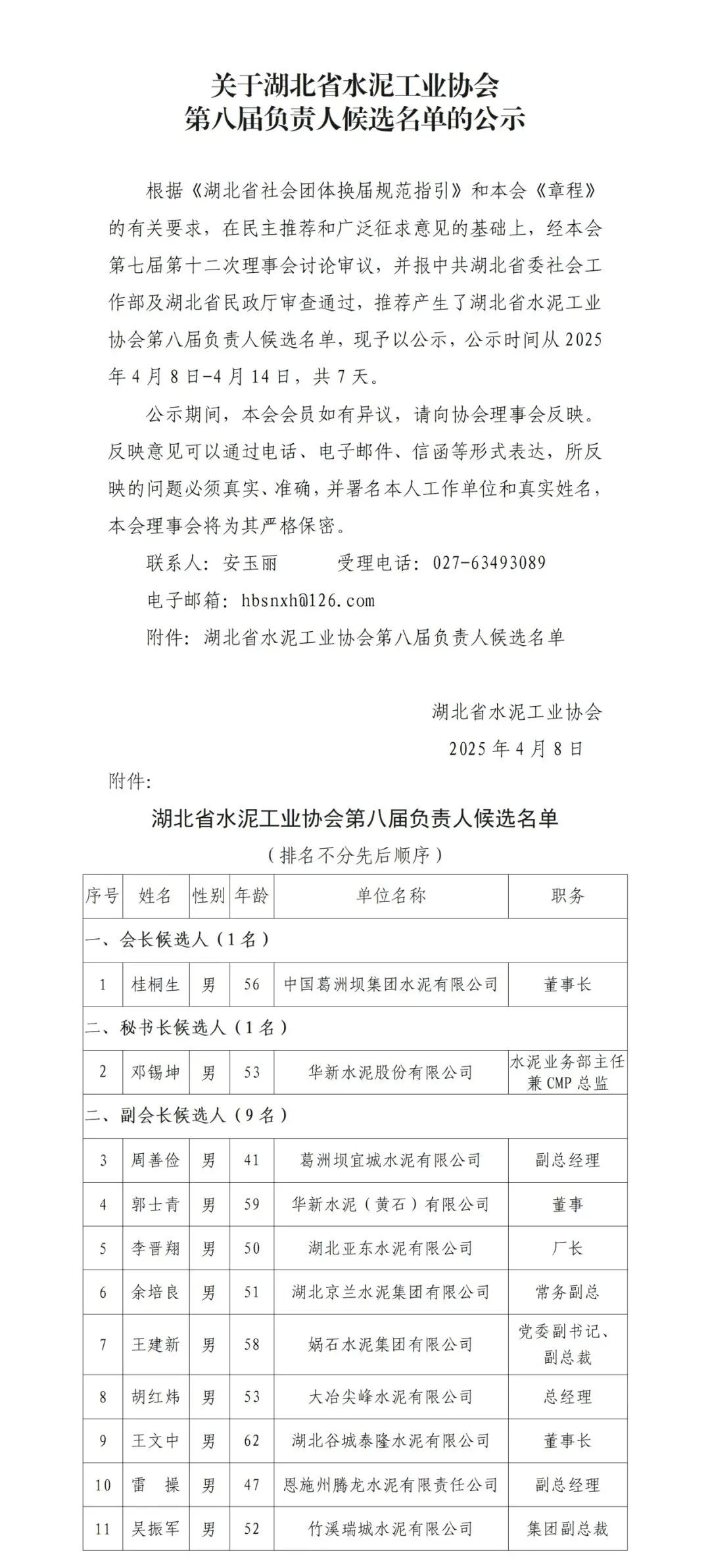 近日,湖北省水泥工業(yè)協(xié)會公布第八屆負責人候選名單,中國葛洲壩集團水泥有限公司董事長桂桐生提名為會長候選人。
