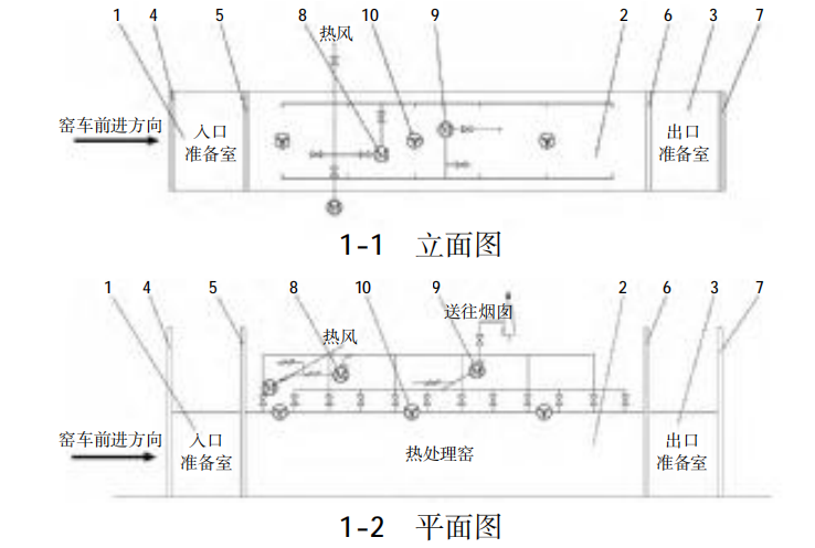 1—入口準(zhǔn)備室;2—熱處理窯本體;3—出口準(zhǔn)備室;