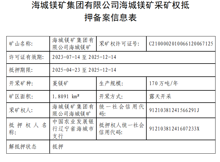 海城鎂礦集團(tuán)有限公司海城鎂礦采礦權(quán)抵押備案網(wǎng)上公開信息下列采礦權(quán)抵押備案信息已經(jīng)采礦權(quán)人和抵押權(quán)人認(rèn)可并告知遼寧省自然資源廳,現(xiàn)予以公開。