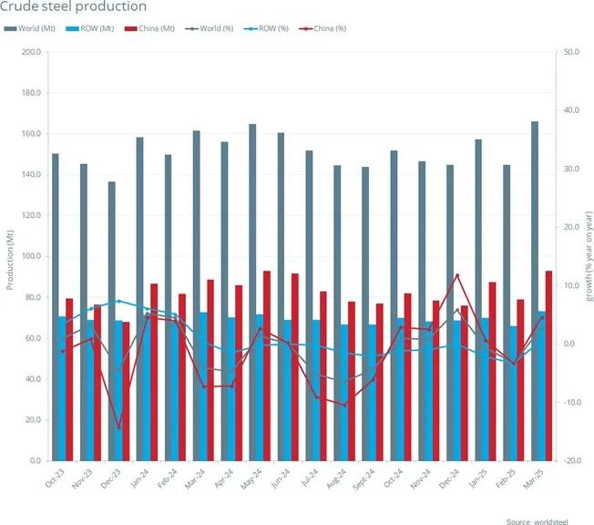 2025年3月全球69個(gè)納入世界鋼鐵協(xié)會統(tǒng)計(jì)國家/地區(qū)的粗鋼產(chǎn)量為1.661億噸,同比提高2.9%。