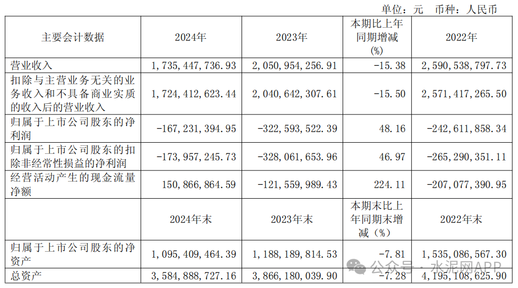 4月21日,福建水泥公布2024年年報,公司營業(yè)收入為17.4億元,同比下降15.4%;歸屬于上市公司股東的凈利潤-1.67億元,去年同期虧損3.23億元。