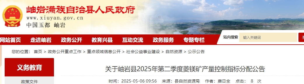 根據(jù)鞍山市菱鎂產(chǎn)業(yè)發(fā)展工作專班《關(guān)于下達鞍山市2025年第2季度菱鎂礦產(chǎn)量控制指標的通知》(鞍鎂專班〔2025〕2號),現(xiàn)對岫巖縣2025年第二季度菱鎂礦產(chǎn)量控制指標分配情況予以公告。