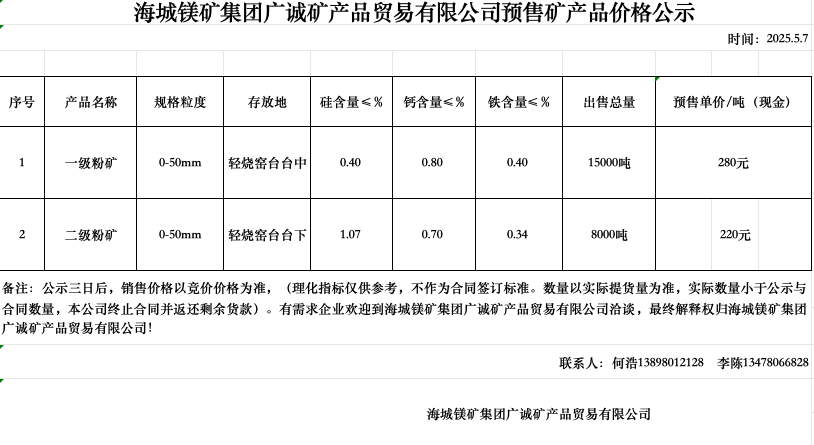 海城鎂礦集團(tuán)廣誠(chéng)礦產(chǎn)品貿(mào)易有限公司預(yù)售礦產(chǎn)品價(jià)格公示