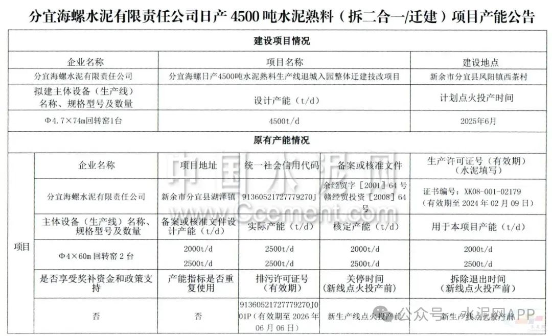 據(jù)了解,2023年11月,江西工信廳發(fā)布“關(guān)于分宜海螺水泥有限責任公司日產(chǎn)4500噸水泥熟料項目產(chǎn)能的公告”稱,分宜海螺水泥擬實施水泥熟料生產(chǎn)線退城入園整體遷建技改項目,將建一條4500t/d熟料生產(chǎn)線,退出公司原有的一條2500t/d及一條2000t/d熟料生產(chǎn)線。