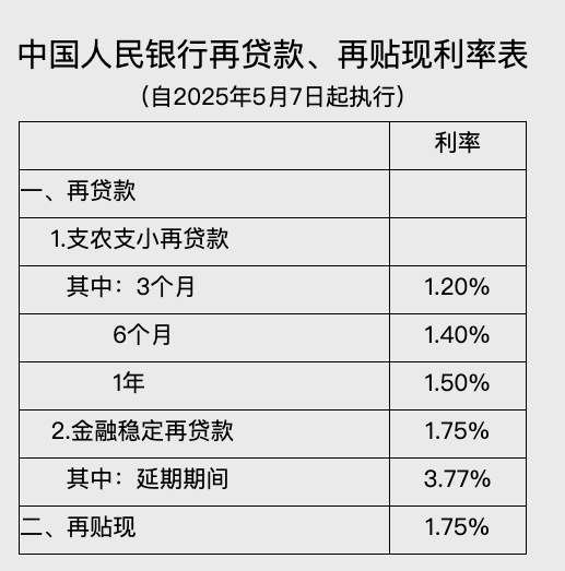 央視網(wǎng)消息:5月7日,中國(guó)人民銀行公布再貸款、再貼現(xiàn)利率表:3個(gè)月、6個(gè)月和1年期支農(nóng)支小再貸款利率分別為1.2%、1.4%和1.5%,金融穩(wěn)定再貸款利率為1.75%,其中延期期間為3.77%,再貼現(xiàn)利率為1.75%。