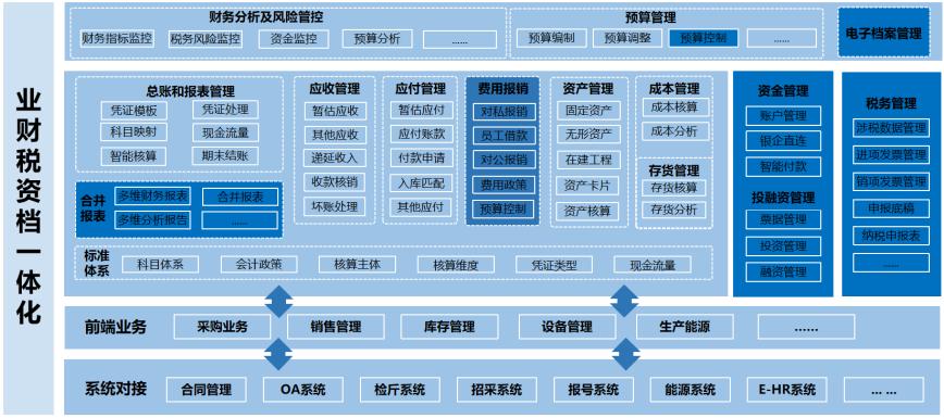 本次項(xiàng)目建設(shè)以促進(jìn)業(yè)財(cái)深度融合、打通內(nèi)外部系統(tǒng)連接、提升數(shù)字化率、減少數(shù)據(jù)落地為目標(biāo),實(shí)現(xiàn)業(yè)、財(cái)、稅、資、檔一體化管理。系統(tǒng)包括總賬、資金、稅務(wù)、預(yù)算、費(fèi)用報(bào)銷、成本、電子會(huì)計(jì)檔案、購銷、庫存等近30個(gè)模塊應(yīng)用,同時(shí)配套開展檢斤系統(tǒng)、報(bào)號系統(tǒng)、云招采、合同管理、設(shè)備管理系統(tǒng)、E-HR、OA、MES、能源系統(tǒng)等升級及對接。實(shí)現(xiàn)與集團(tuán)統(tǒng)一平臺、對標(biāo)補(bǔ)齊的同時(shí),打造資金、稅務(wù)、預(yù)算、費(fèi)用報(bào)銷等集團(tuán)標(biāo)桿試點(diǎn)應(yīng)用。
