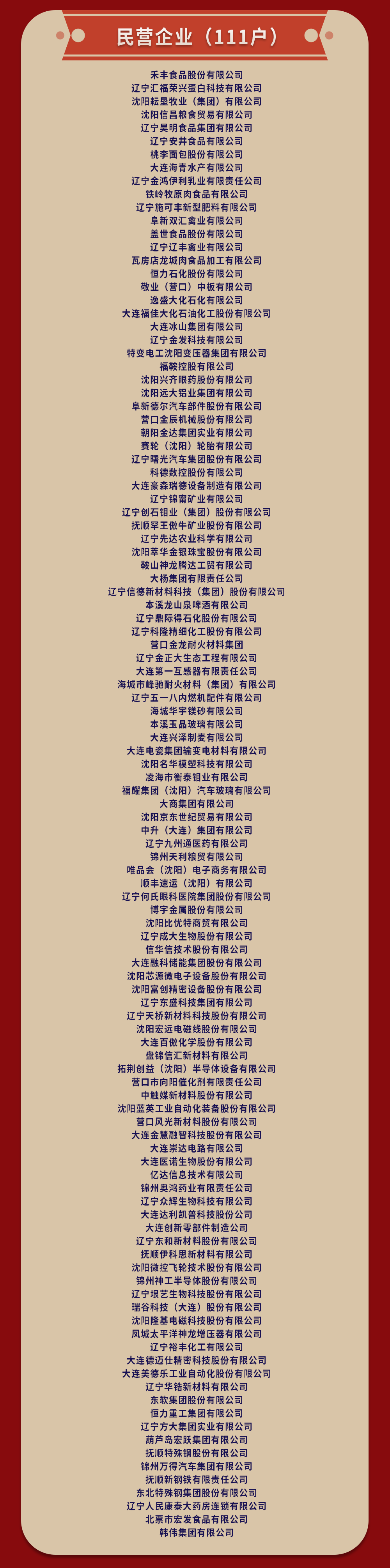 為進(jìn)一步調(diào)動(dòng)廣大企業(yè)助力遼寧全面振興的積極性、主動(dòng)性、創(chuàng)造性,提振信心、激發(fā)干勁,鼓勵(lì)和支持各類企業(yè)競(jìng)相發(fā)展,省委省政府決定,對(duì)在全面振興新突破三年行動(dòng)攻堅(jiān)之年作出突出貢獻(xiàn)的241戶企業(yè)予以通報(bào)表?yè)P(yáng)。具體名單如下。
