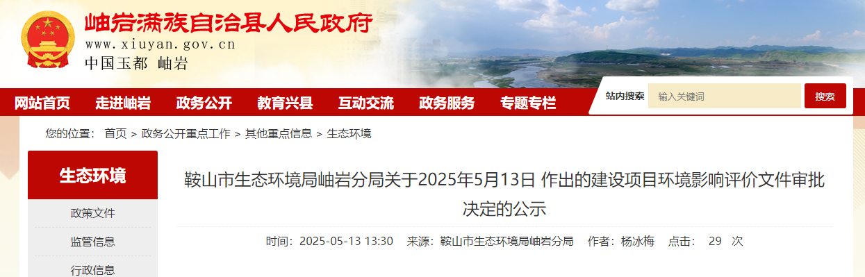 根據(jù)建設項目環(huán)境影響評價審批程序管理的有關規(guī)定,經(jīng)審查,2025年5月13日我局對建設項目環(huán)境影響評價文件申請作出審批決定?,F(xiàn)將作出的審批決定情況予以公告,公告期為2025年5月13日-2025年5月21日(7日)。