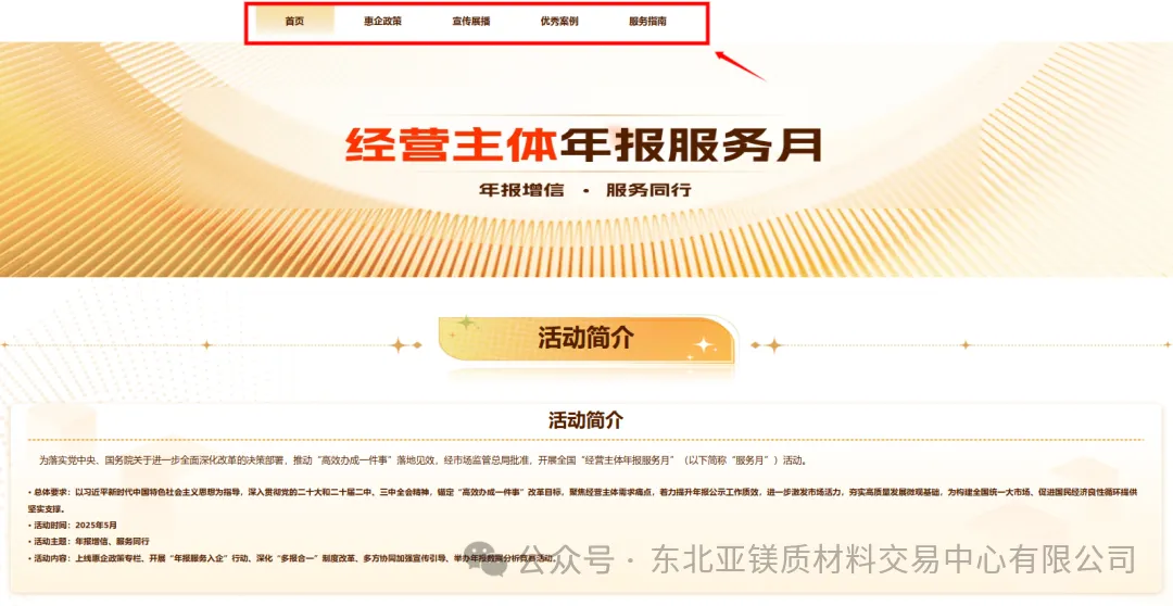 三、進(jìn)入“經(jīng)營主體年報服務(wù)月”頁面后,可在上方選擇不同的子頁面閱覽各類信息,通過“惠企政策”“宣傳展播”“優(yōu)秀案例”等專欄可充分了解年報報送要求、注意事項、常見問題等信息,幫助大家更高效地掌握年報重點(diǎn),提前規(guī)避可能存在的“坑”。