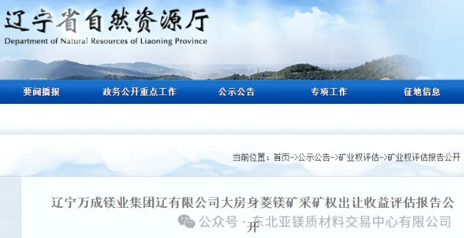 按照《關(guān)于完善礦業(yè)權(quán)出讓收益評(píng)估程序的通知》(遼自然資辦發(fā)[2022]2號(hào))要求,《遼寧萬成鎂業(yè)集團(tuán)有限公司大房身菱鎂礦采礦權(quán)出讓收益評(píng)估報(bào)告》及相關(guān)附件已在省自然資源廳公示10個(gè)工作日,無異議,予以公開。