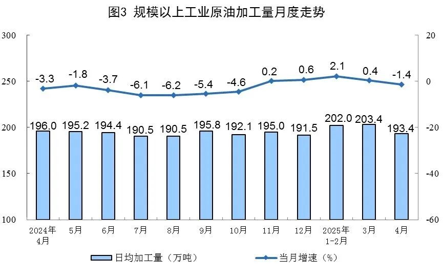 原油生產(chǎn)保持增長。4月份,規(guī)上工業(yè)原油產(chǎn)量1772萬噸,同比增長1.5%,增速比3月份放緩2.0個百分點;日均產(chǎn)量59.1萬噸。
