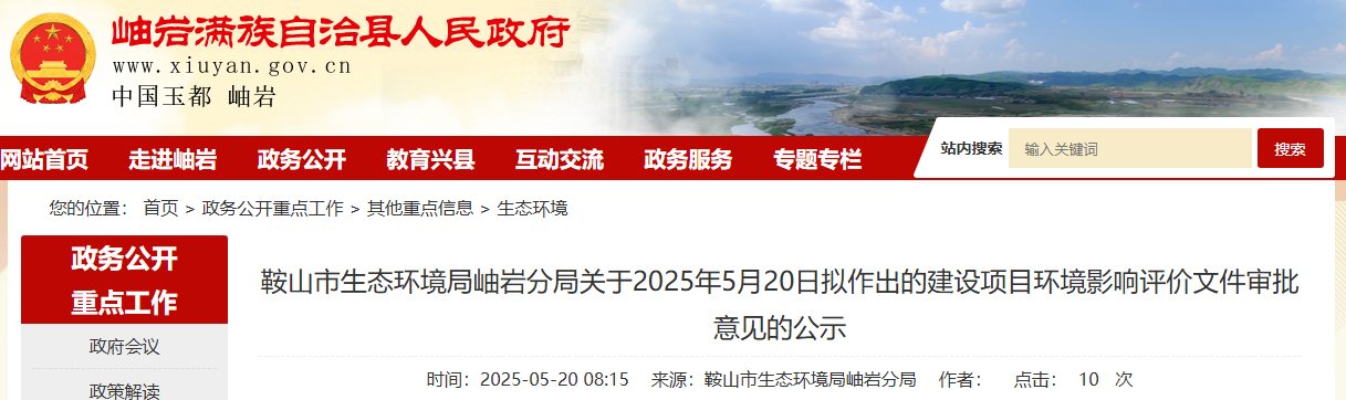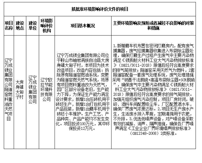 根據(jù)建設項目環(huán)境影響評價審批程序的有關規(guī)定,經(jīng)審查,岫巖縣生態(tài)環(huán)境局擬對《遼寧萬成鎂業(yè)集團有限公司隧道窯燃料重油改天然氣項目環(huán)境影響報告表》作出審批意見。為保證此次審查工作的嚴肅性和公正性,現(xiàn)將擬作出審批意見的環(huán)境影響評價文件基本情況予以公示,公示期為5個工作日。聽證權利告知:依據(jù)《中華人民共和國行政許可法》,自公示起五日內申請人、利害關系人可對以下擬作出的建設項目環(huán)境影響評價文件審批意見要求聽證。