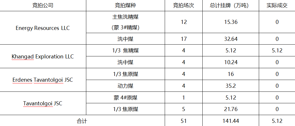 蒙古國煤炭電子競拍市場繼續(xù)呈現(xiàn)供需寬松格局,價(jià)格下行壓力進(jìn)一步加大。從市場表現(xiàn)來看,ER公司的主焦精煤及動力煤線上競拍依然無人問津,延續(xù)了全面流拍的態(tài)勢;KH公司1/3焦精煤雖然以605元/噸的價(jià)格成交1.28萬噸,但較上周成交價(jià)大幅下跌65元/噸,反映出市場采購意愿持續(xù)走弱。