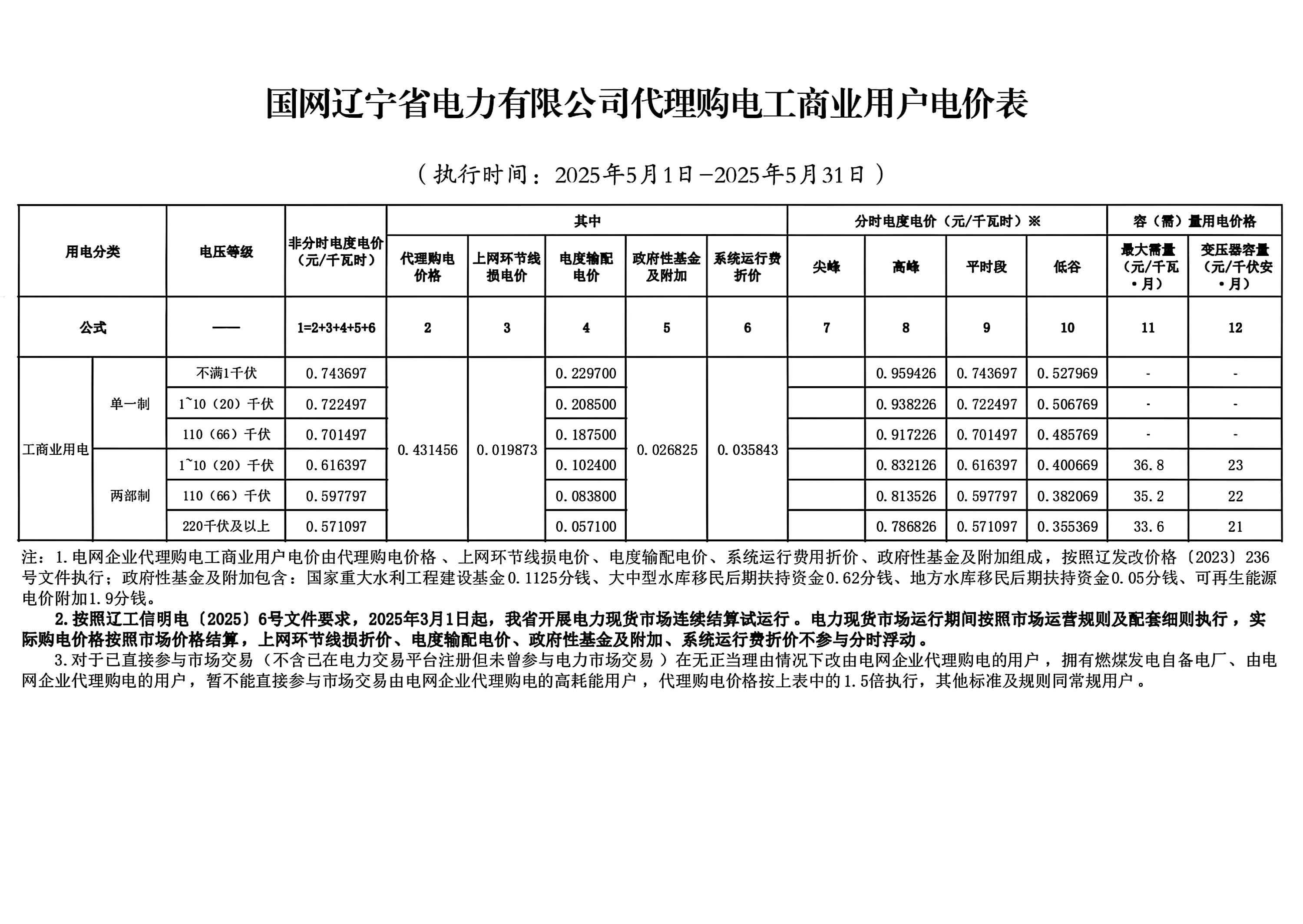 國(guó)網(wǎng)遼寧省電力有限公司代理購(gòu)電工商業(yè)電價(jià)表(2025年5月)