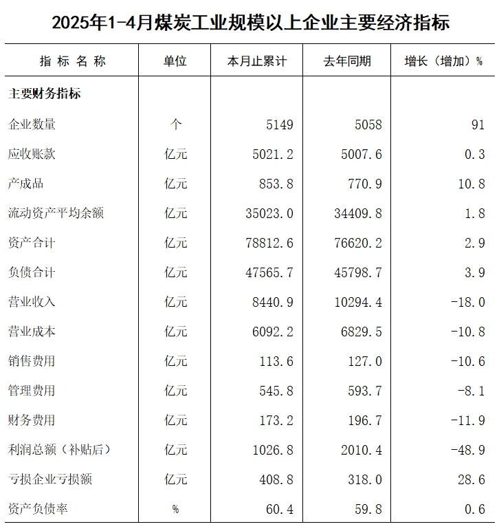 2025年1-4月煤炭工業(yè)規(guī)模以上企業(yè)主要經(jīng)濟(jì)指標(biāo)